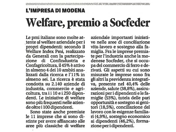 Nel Welfare Index PMI 2016 Il 2° posto è stato attribuito a Socfeder, azienda modenese che si occupa del commercio di ferro e derivati. Durante l’evento, il PMI Index ha premiato le 11 imprese che si sono distinte per aver affiancato alle aree più classiche di welfare aziendale importanti iniziative nelle aree di conciliazione vita-lavoro e sostegno alla famiglia.